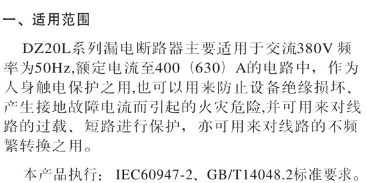 DZ20L系列漏電斷路器主要適用于交流380V頻率為50Hz,額定電流至400(630)A的電路中,作為人身觸電保護(hù)之用,也可以用來防止設(shè)備絕緣損壞、產(chǎn)生接地故障電流而引起的火災(zāi)危險(xiǎn),并可用來對(duì)線路的過載、短路進(jìn)行保護(hù),亦可用來對(duì)線路的不頻繁轉(zhuǎn)換之用。
