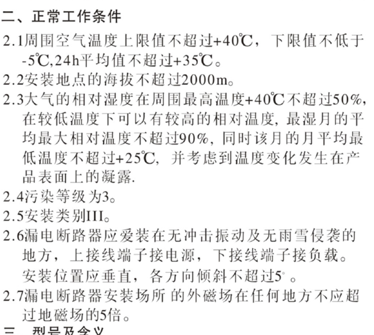 2.6漏電斷路器應(yīng)愛裝在無沖擊振動(dòng)及無雨雪侵襲的地方,上接線端子接電源,下接線端子接負(fù)載。安裝位置應(yīng)垂直,各方向傾斜不超過5°。